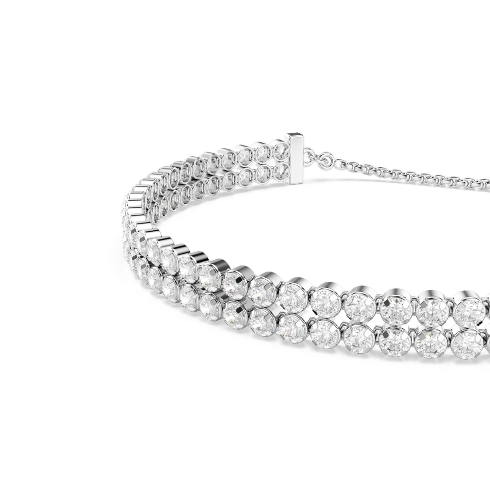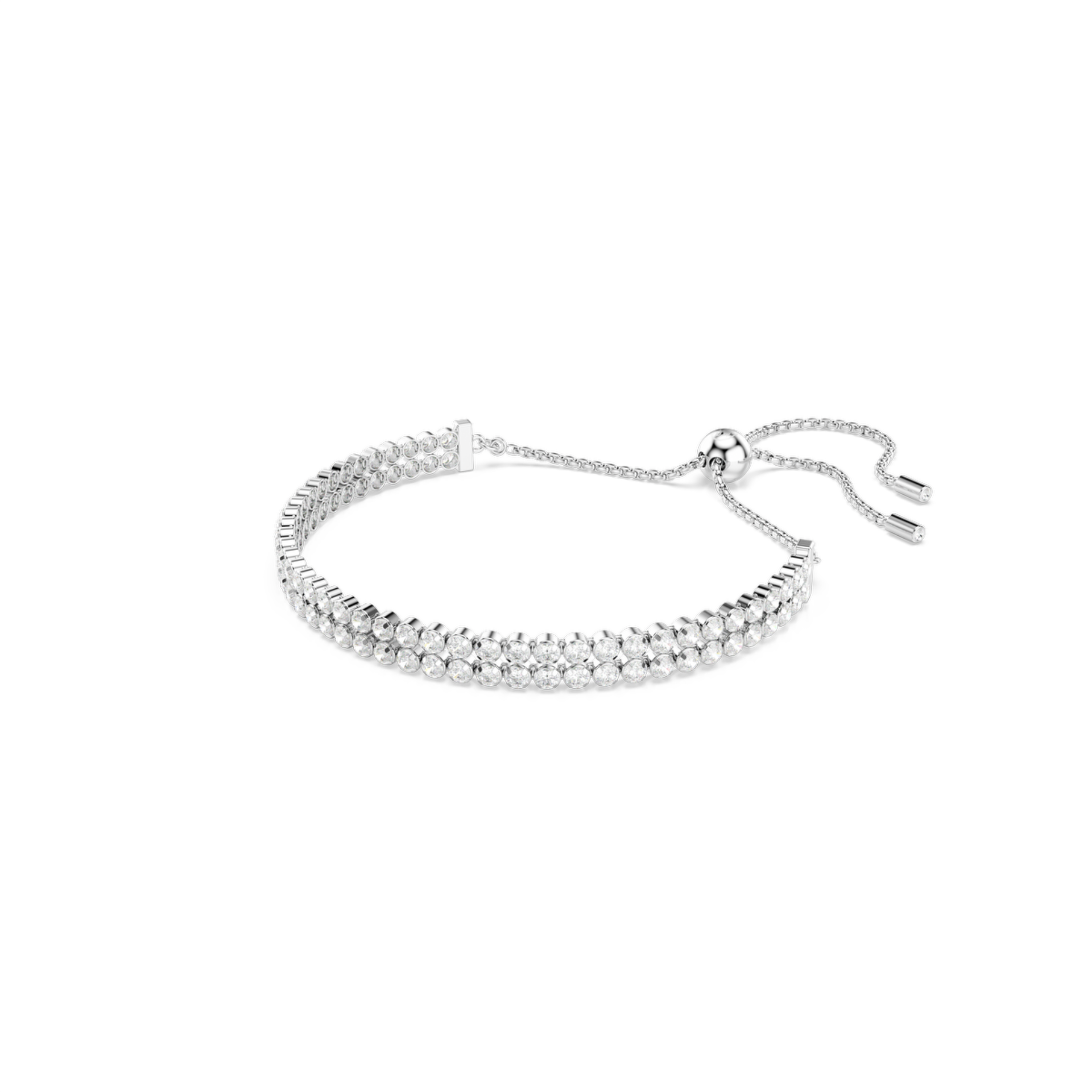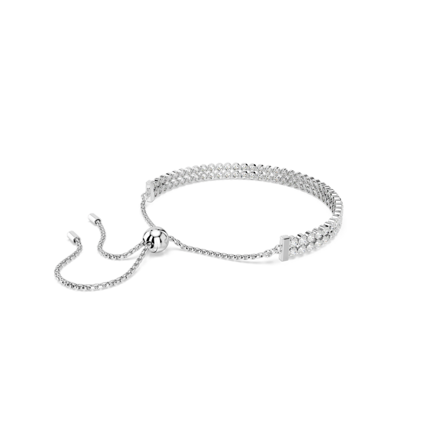 Ta ponadczasowa bransoletka z powłoką z rodu to idealny prezent dla osób rozmiłowanych w blasku. Dwa delikatne pasma cyrkonii Swarovskiego są osadzone w eleganckiej taśmie kryształowej, która pięknie układa się na nadgarstku. Całość wykończona jest innowacyjnym zapięciem przesuwnym w formie kuli, które umożliwia idealne dopasowanie rozmiaru. Noś tę bransoletkę, aby dodać wyrafinowania codziennym stylizacjom, lub połącz ją z kontrastującą biżuterią, aby uatrakcyjnić wieczorowe kreacje.