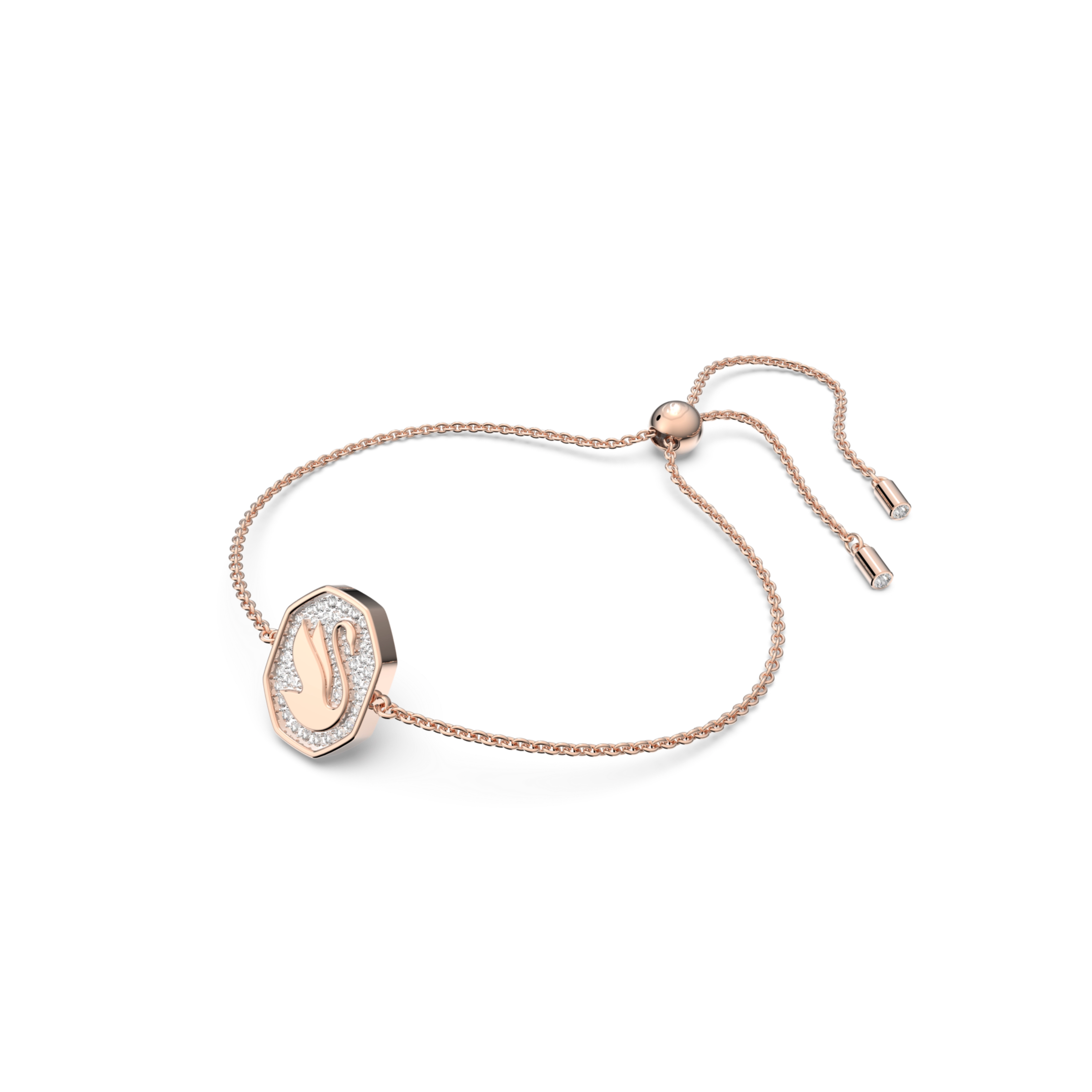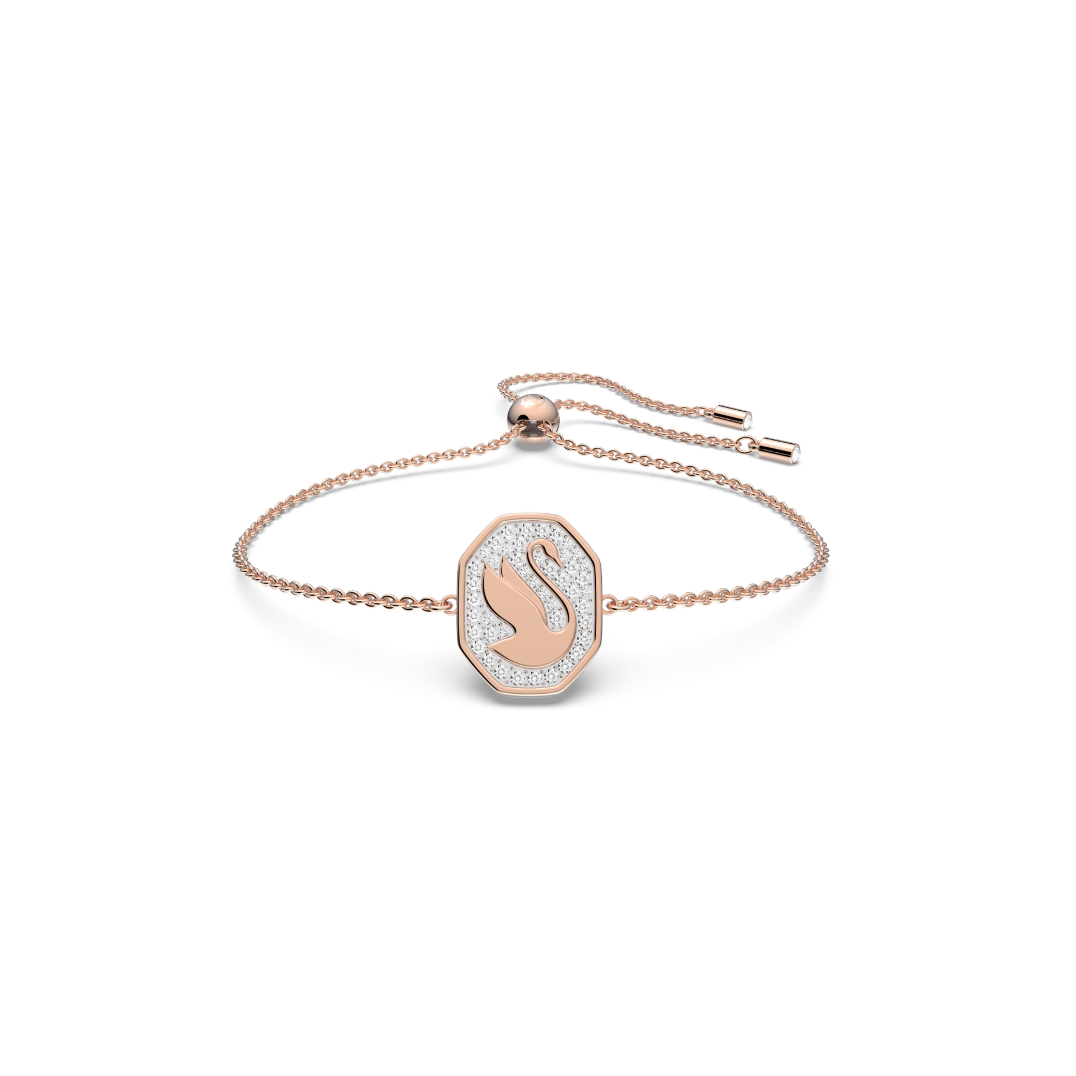 Ta delikatna bransoletka z powłoką w odcieniu różowego złota łączy w sobie dwa symbole: kultowy ośmiokąt i przepięknego łabędzia marki Swarovski. Centralny detal okalają olśniewające kryształy bezbarwne uzupełnione delikatnym łańcuszkiem z regulowanym zapięciem. Noś ją samą lub z pasującymi do niej kolczykami i naszyjnikiem z rodziny Signum. Bransoletka jest częścią rodziny Signum zaprojektowanej przez Dyrektor Kreatywną Giovannę Engelbert w ramach Collection II.