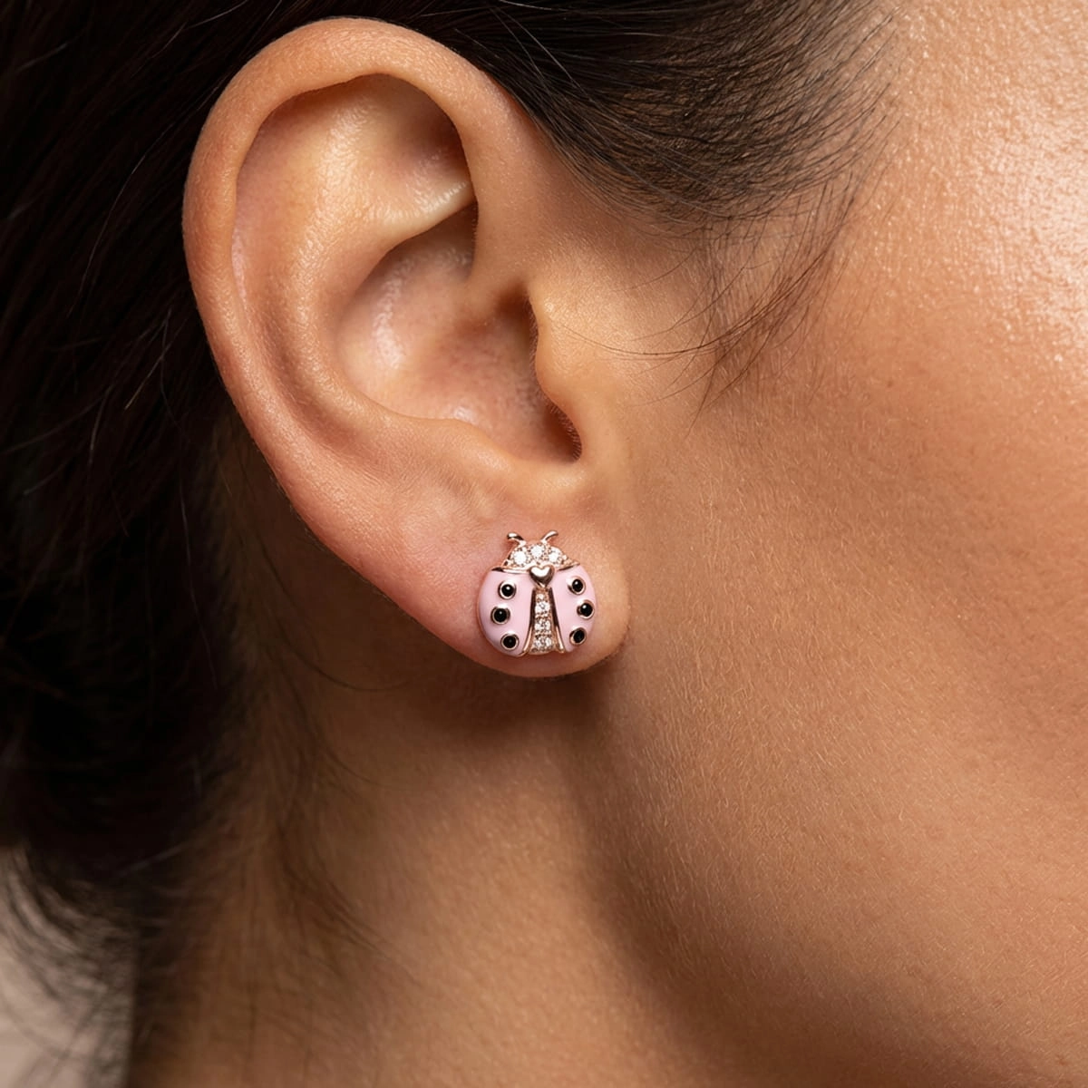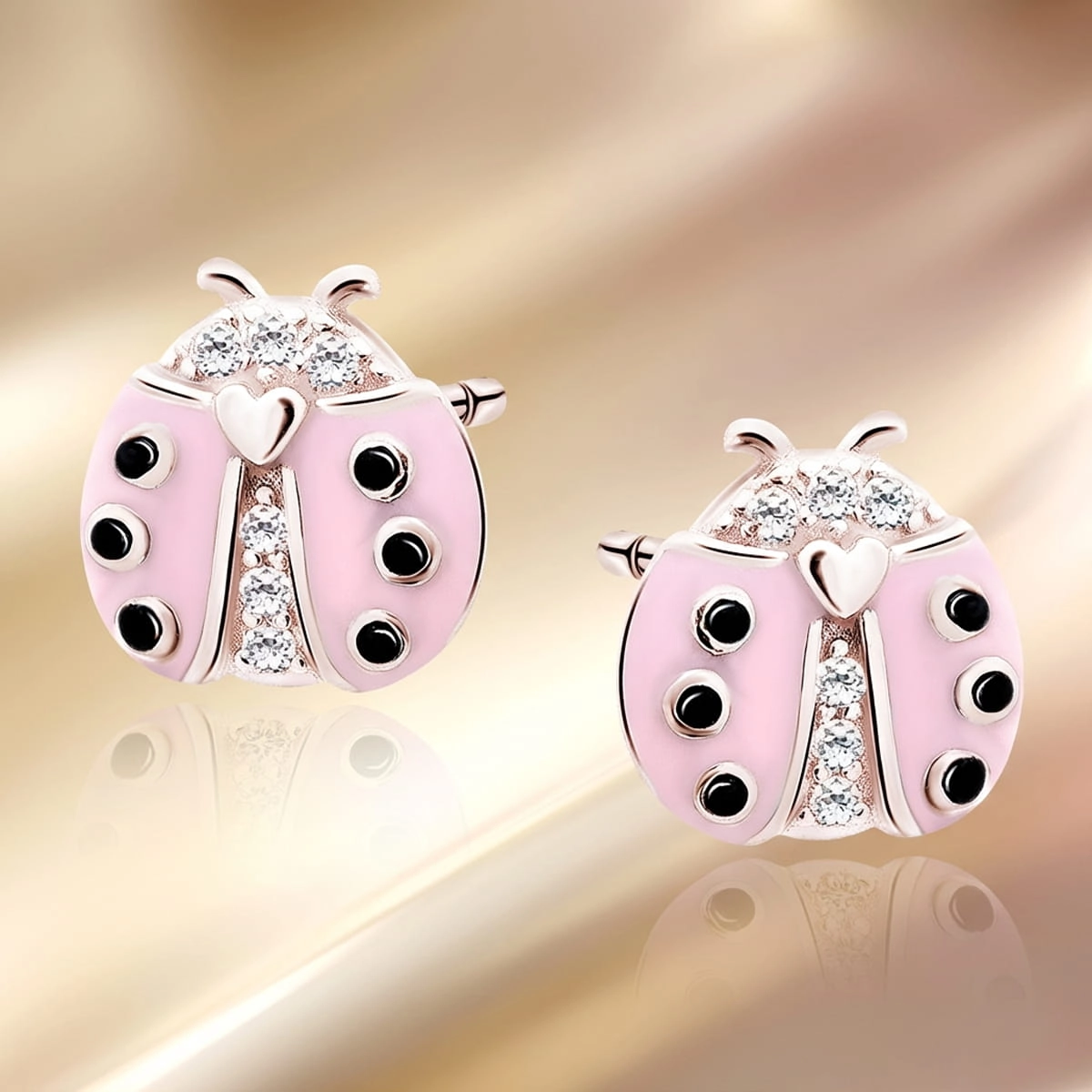 Dziecięce Kolczyki, Srebro 925, Różowa Biedronka z Cyrkoniami, Różowe Złoto