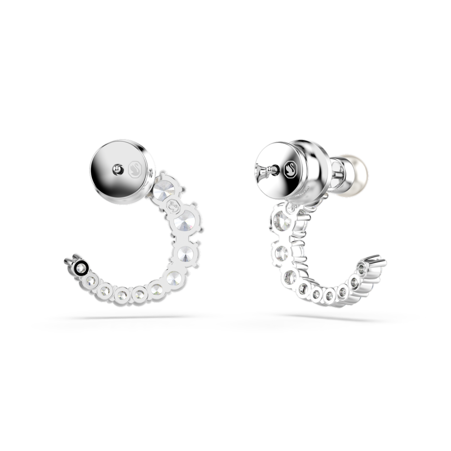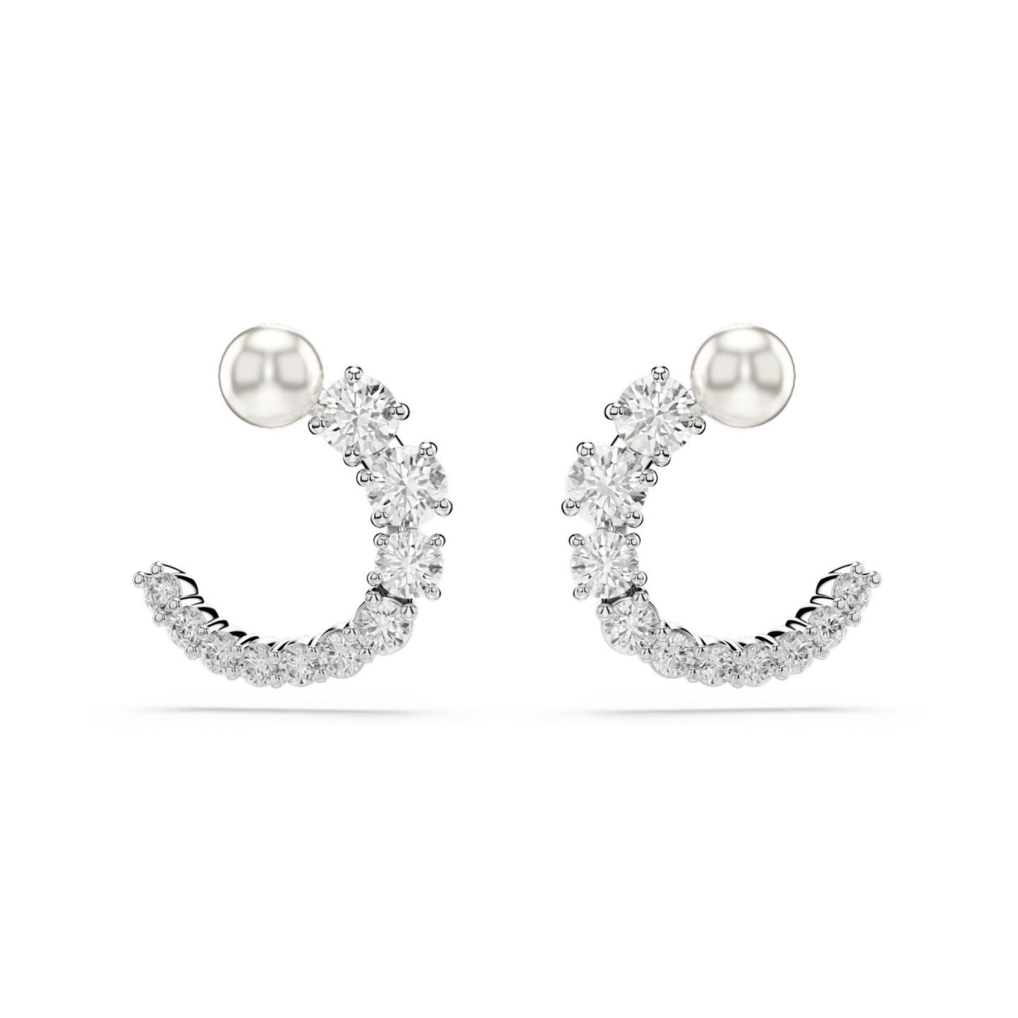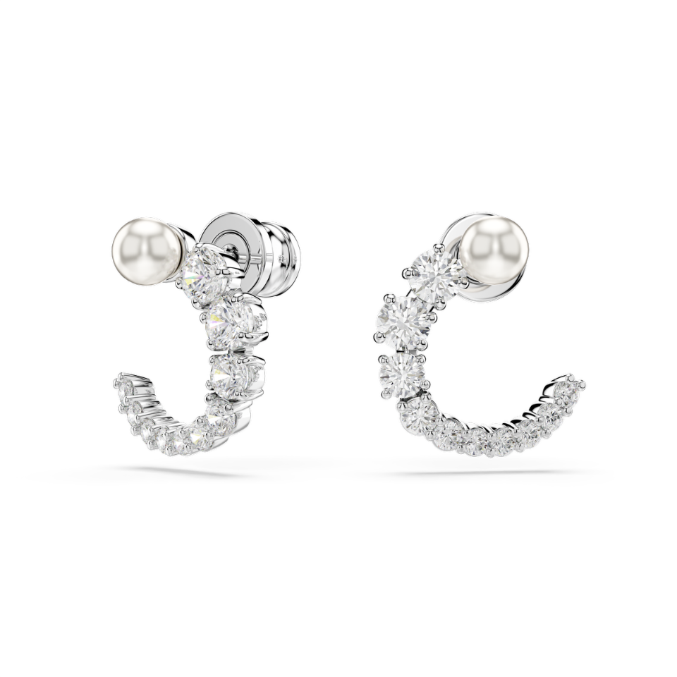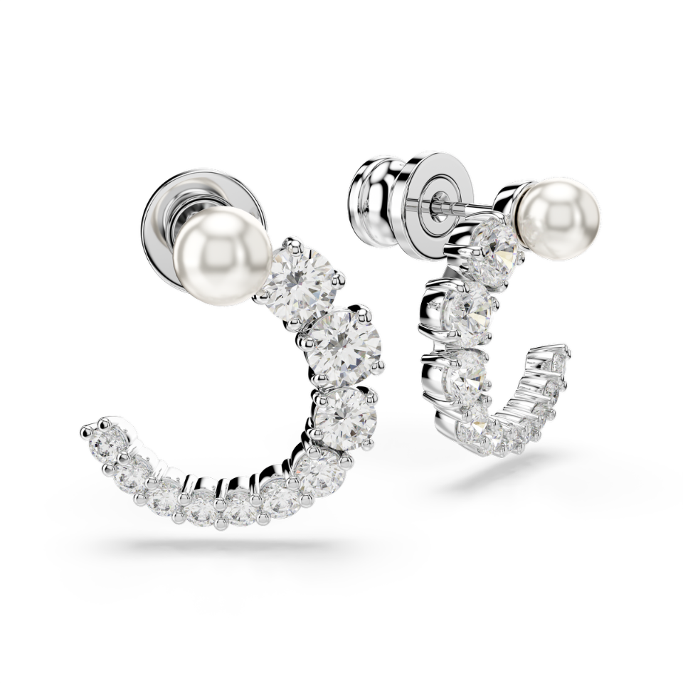 Te kolczyki urzekają pięknem każdego detalu. Każdy z tych kolczyków na sztyfcie z powłoką z rodu ma formę otwartej obręczy, która jest pokryta bezbarwnymi cyrkoniami Swarovskiego ułożonymi od najmniejszej do największej i przybrana u góry białą kryształową perłą Swarovskiego. Warto dodać do kompletu pasujący naszyjnik z wisiorkiem z rodziny Matrix, aby skupić na sobie całą uwagę.