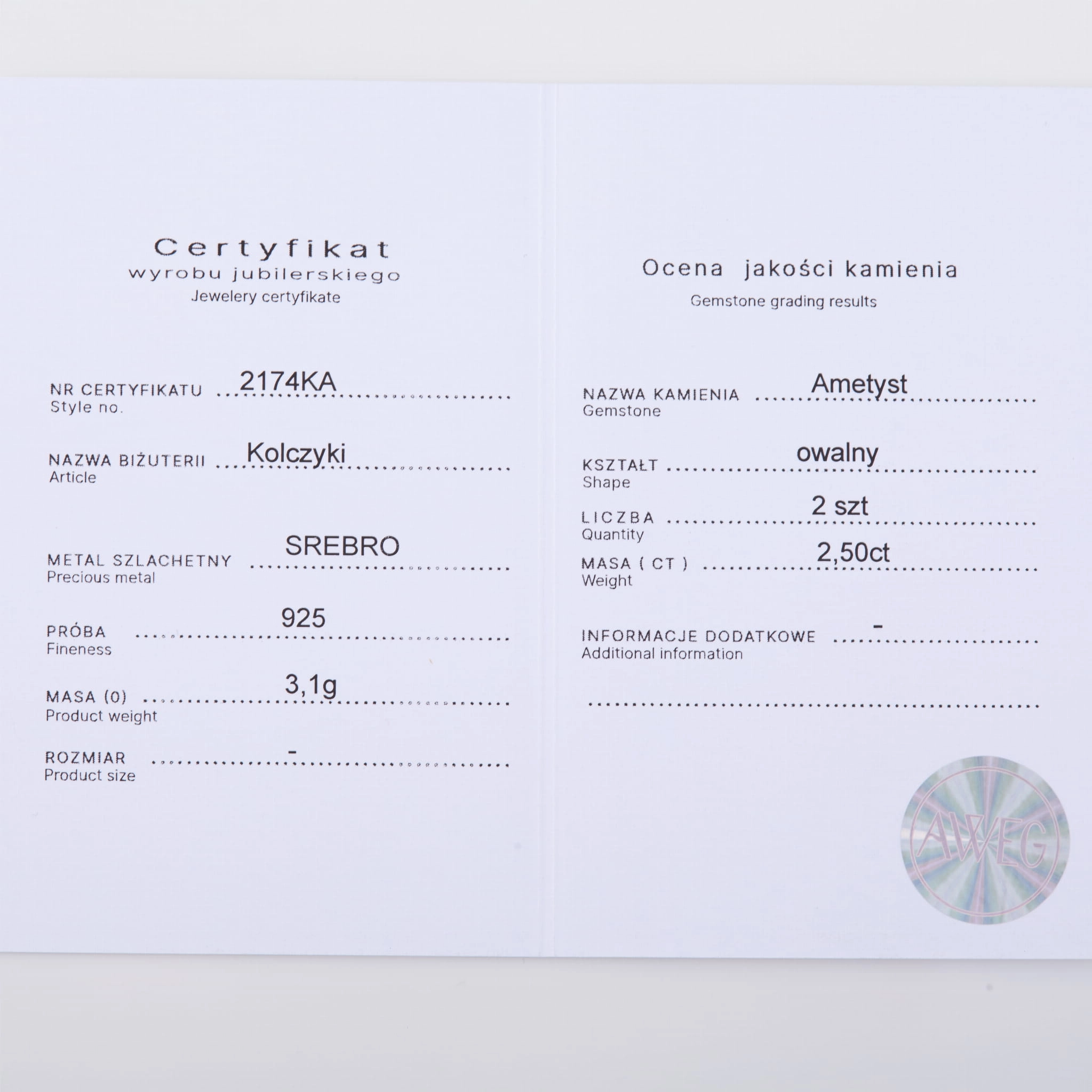 MAŁE KOLCZYKI WISZĄCE AMETYST 2,50 CT SREBRO 925 NATURALNE CERTYFIKAT