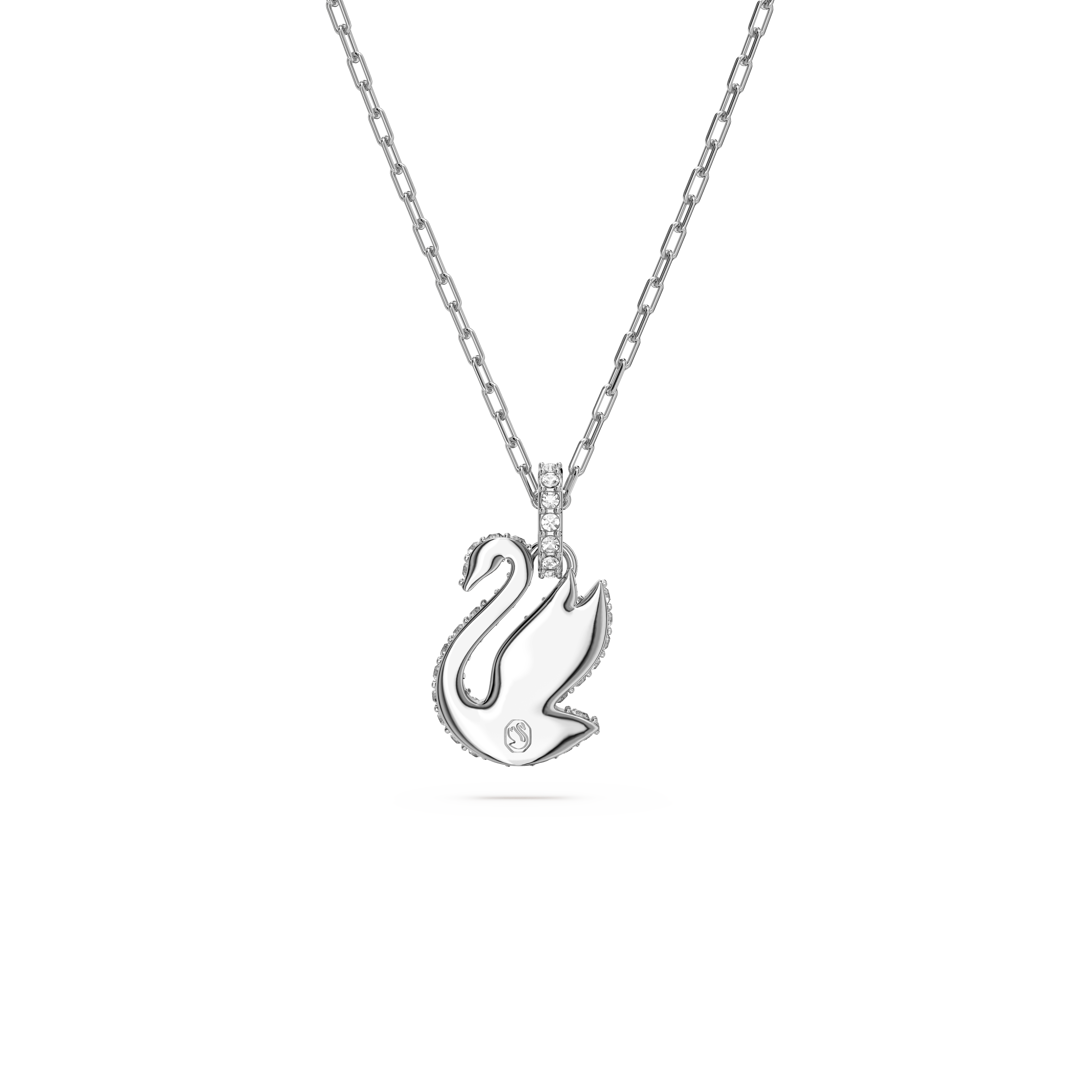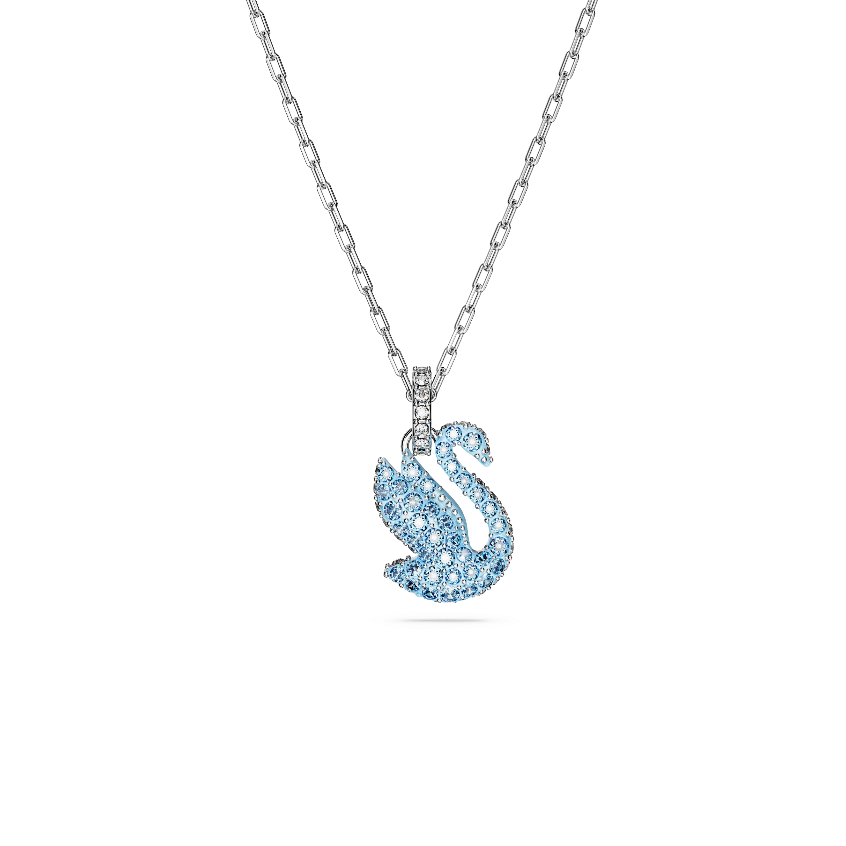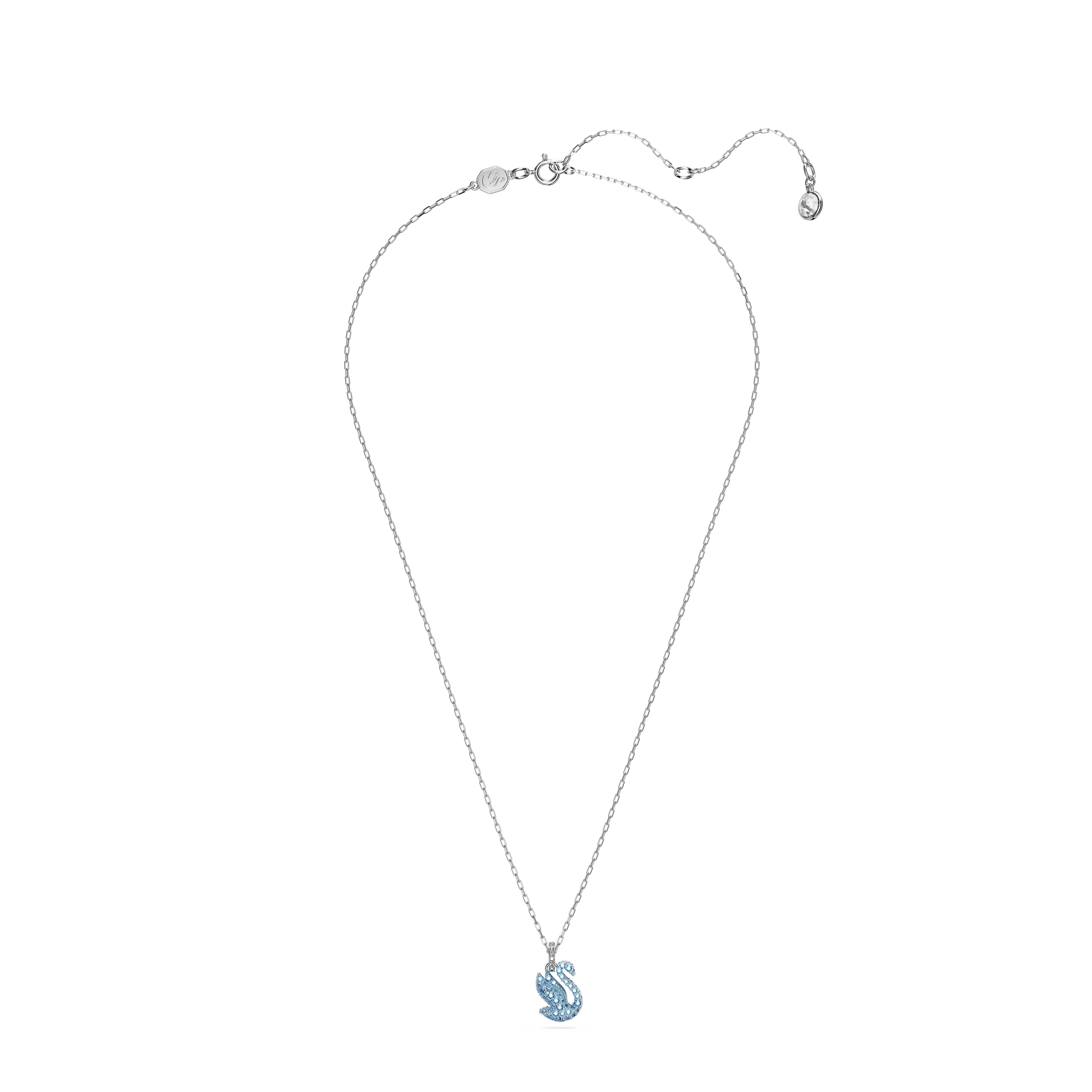 Ten promieniejący blaskiem, miniaturowy naszyjnik z wisiorkiem jest kolorową reinterpretacją kultowego łabędzia Swarovski. Zawieszony na delikatnym łańcuszku wzór eksponuje elegancki motyw, upiększony na całej powierzchni błyszczącymi jasnoniebieskimi kryształami w oprawie brukowej. Jego sugestywny kolor doda blasku dyskretnej elegancji każdej stylizacji.