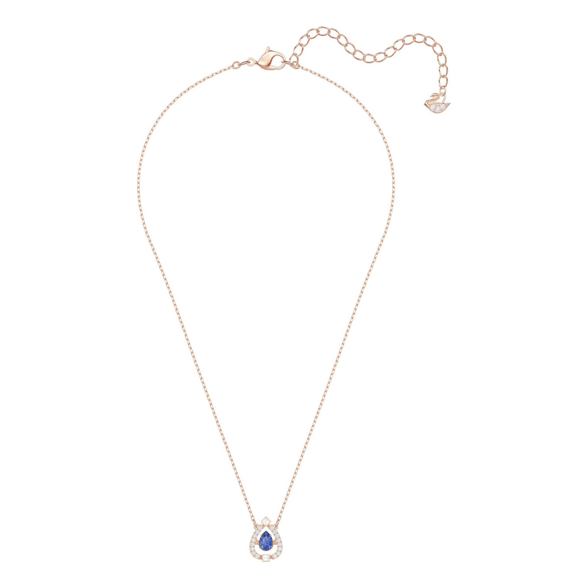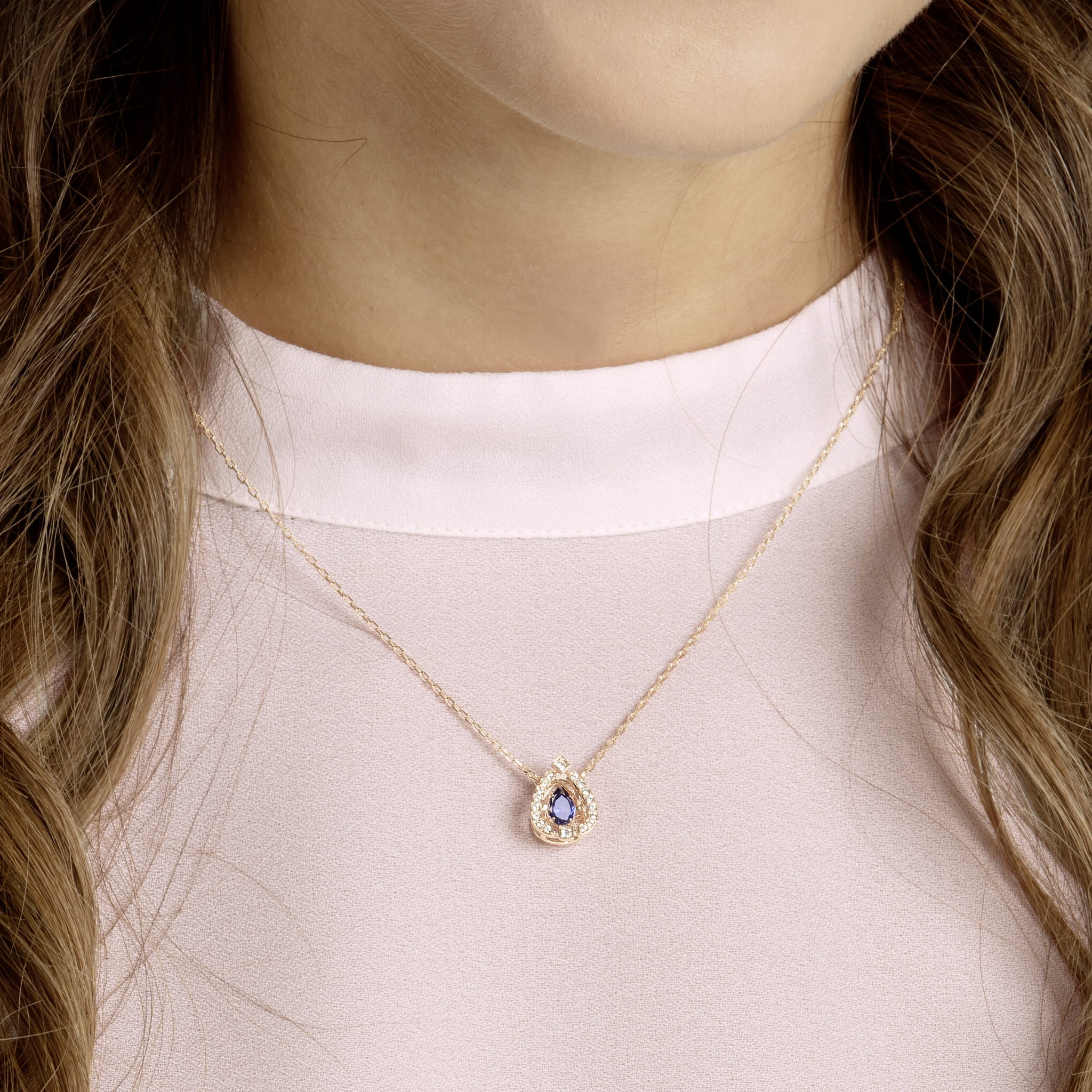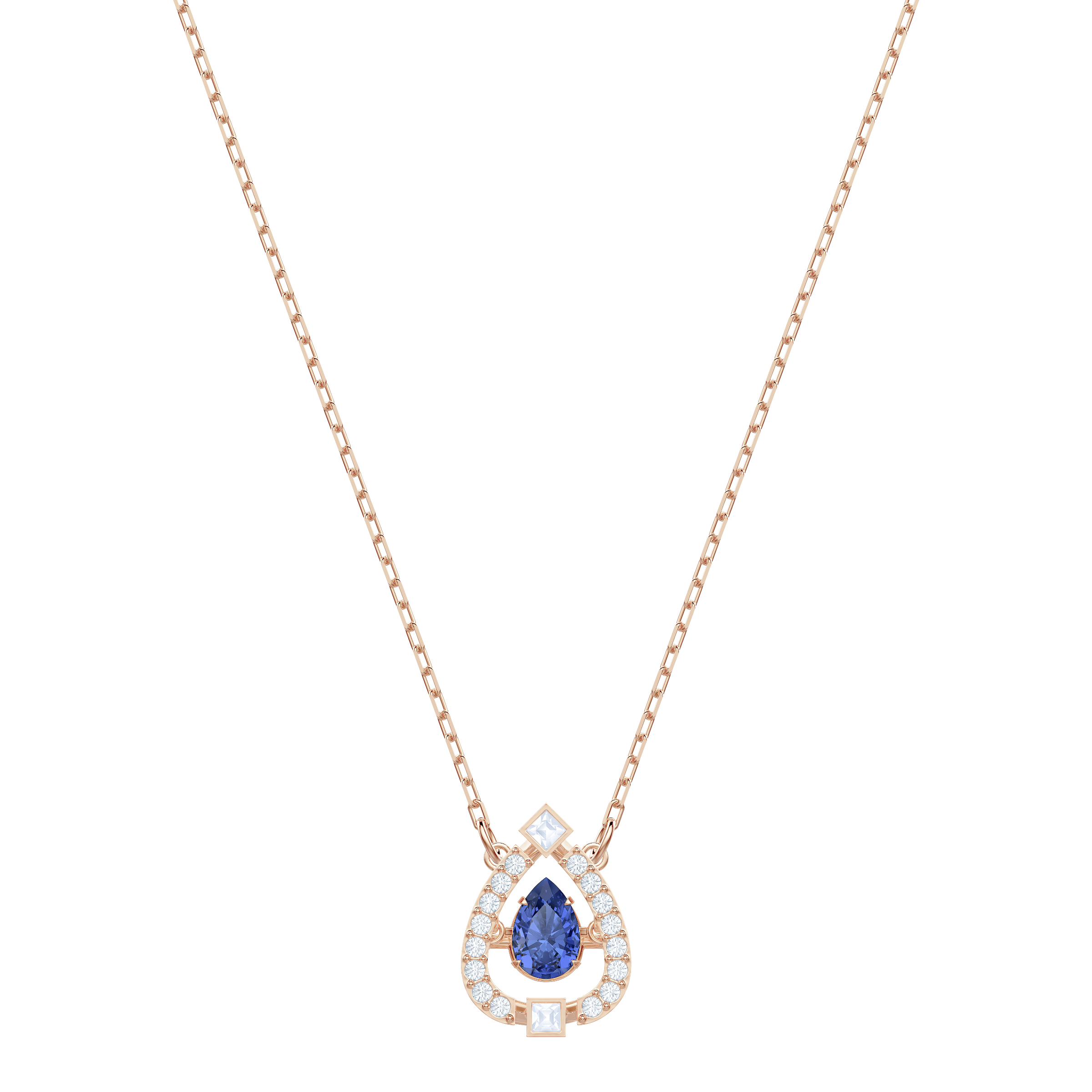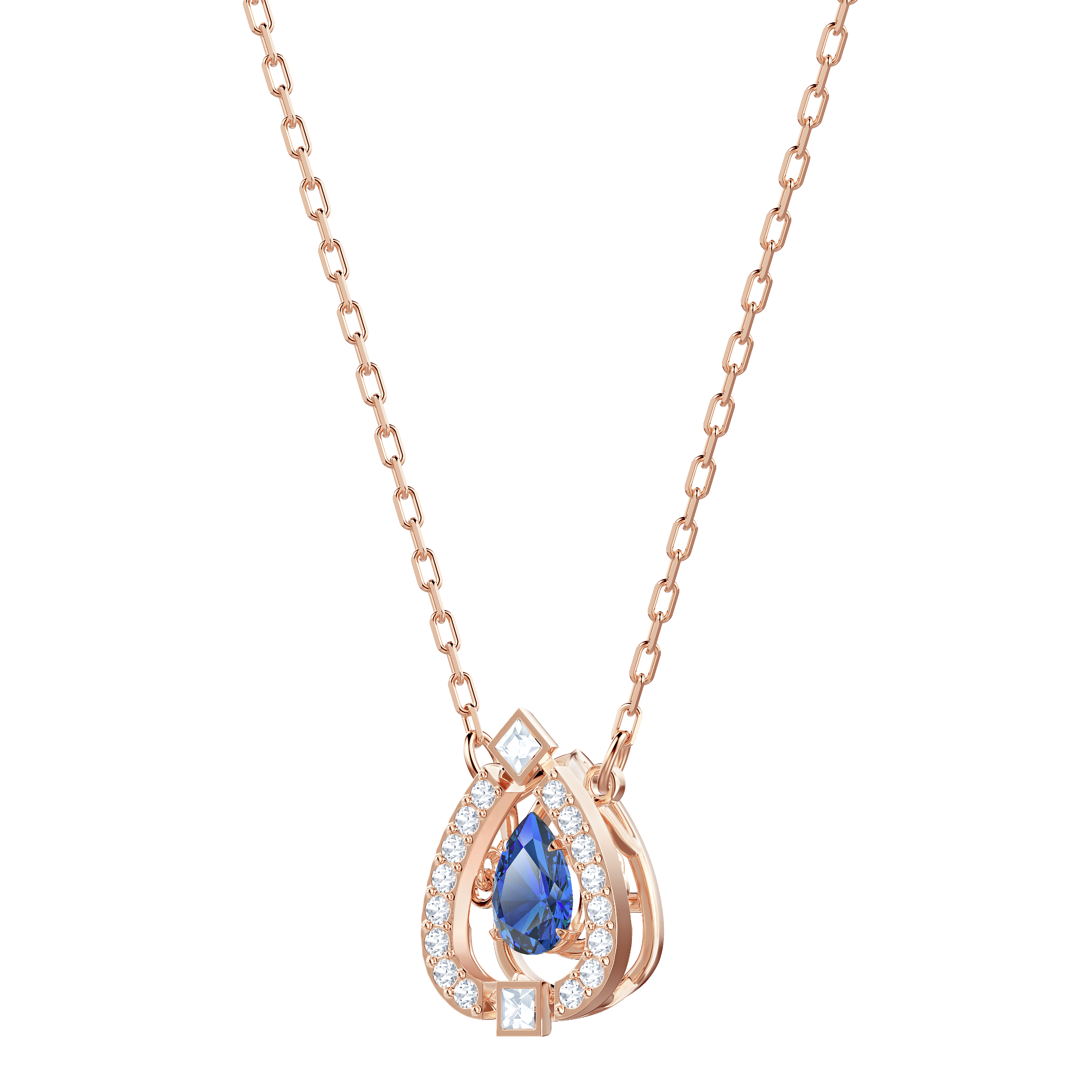 Doskonały prezent z okazji Dnia Matki. Ten ponadczasowy naszyjnik powlekany różowym złotem inspirowany jest koncepcją „roztańczonego kryształu”. Pełen przepychu wzór ozdobiony jest niebieskim kamieniem w kształcie łzy, umieszczonym wewnątrz trójwymiarowego oplotu w szklanej oprawie pavé. Obowiązkowy dodatek do każdej szkatułki z biżuterią, który doda eleganckim stylizacjom nieco wesołego blasku.