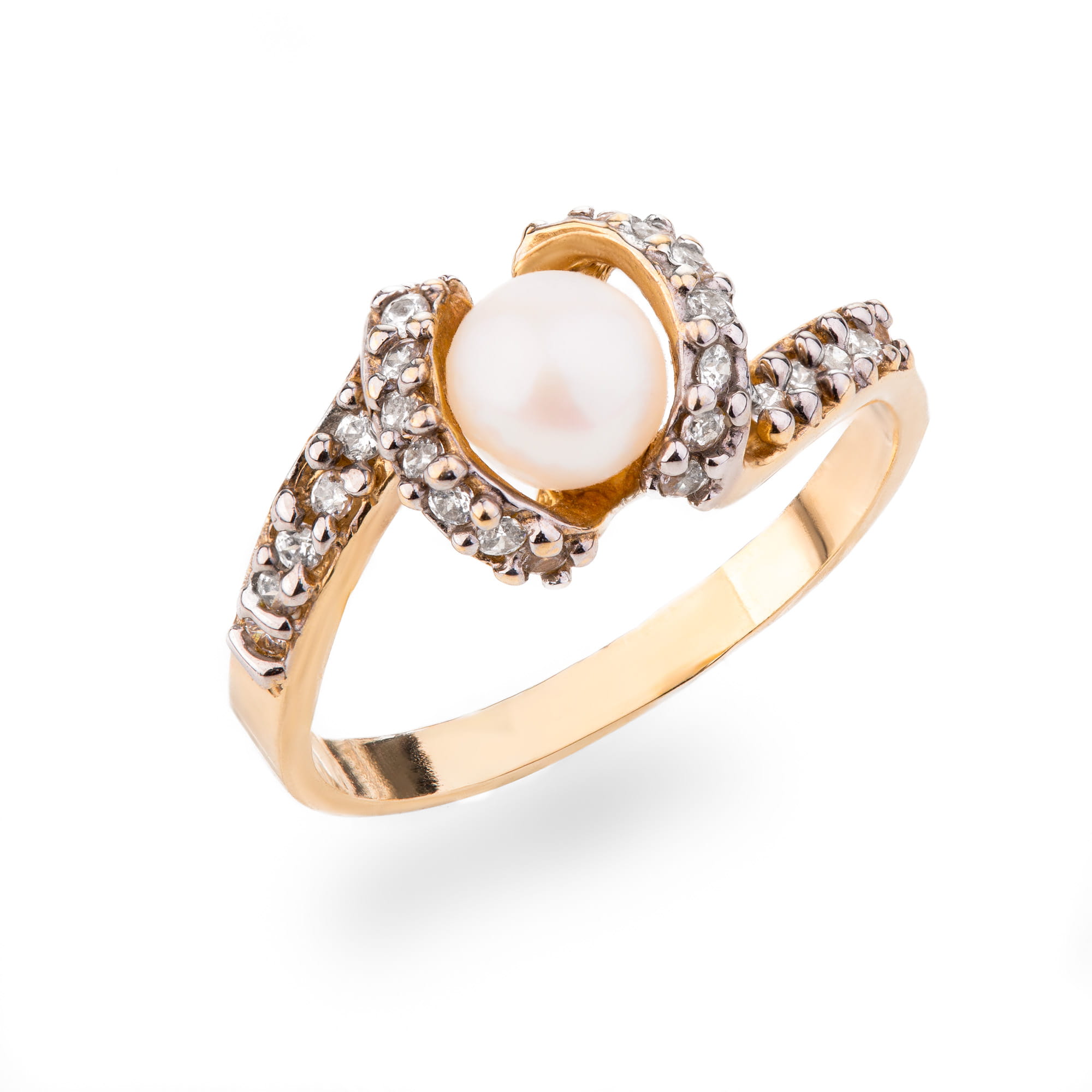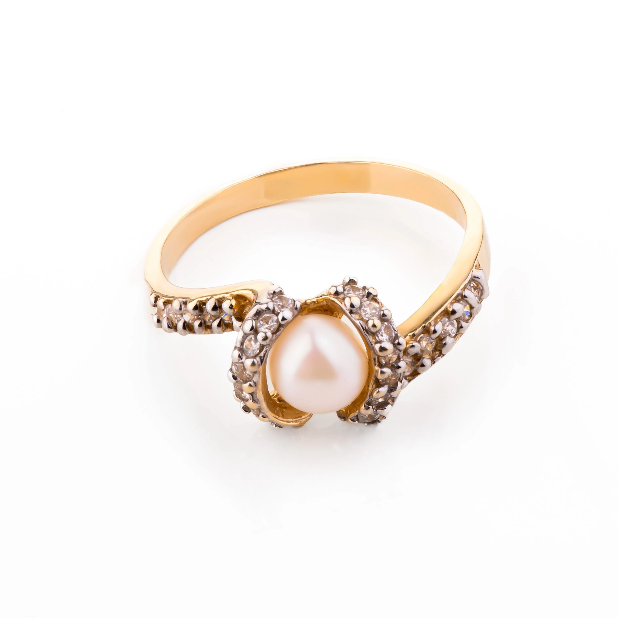 Pierścionek złoty 585 z cyrkoniami i perłą (14K), roz. 15.00