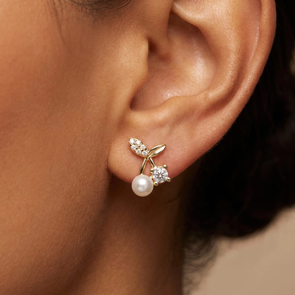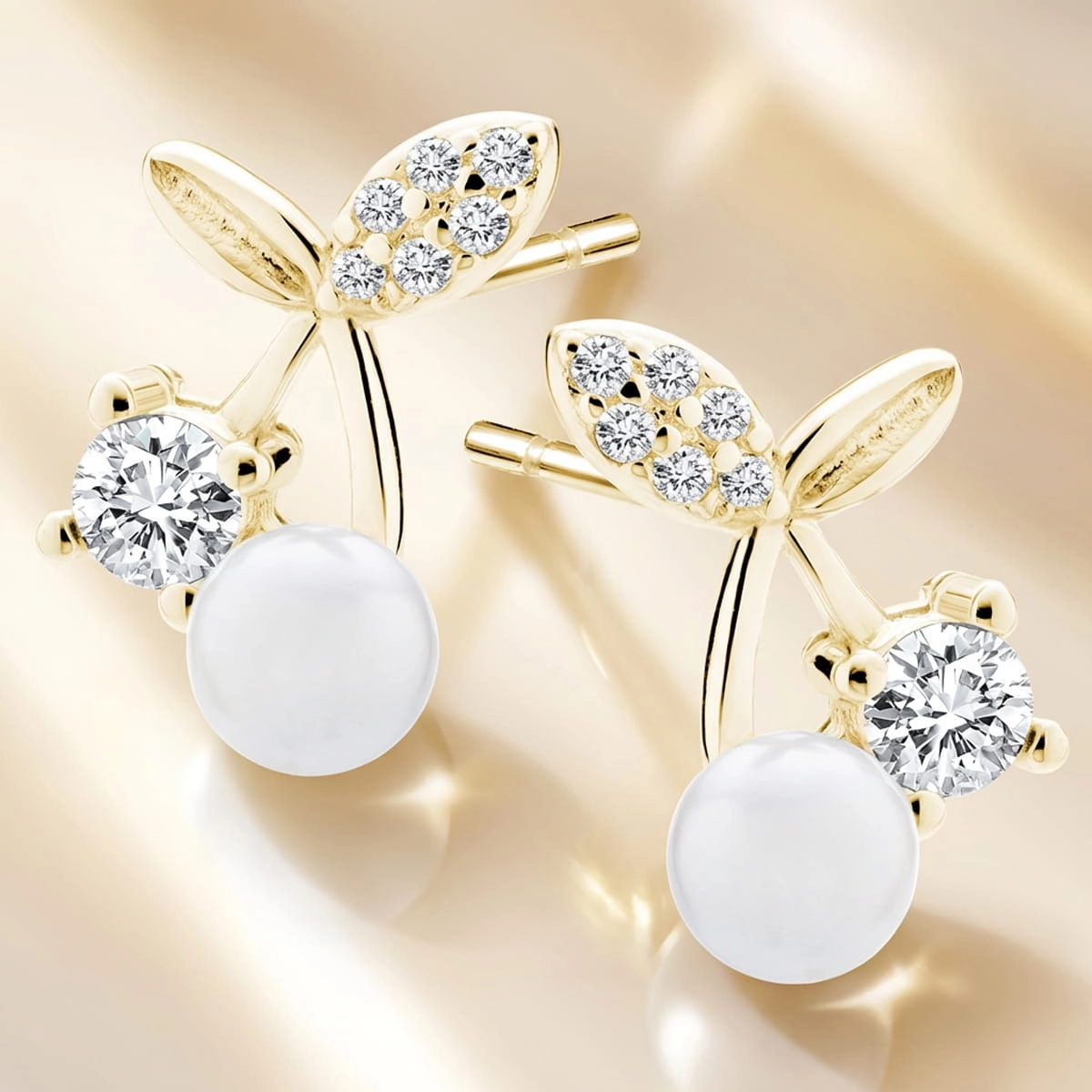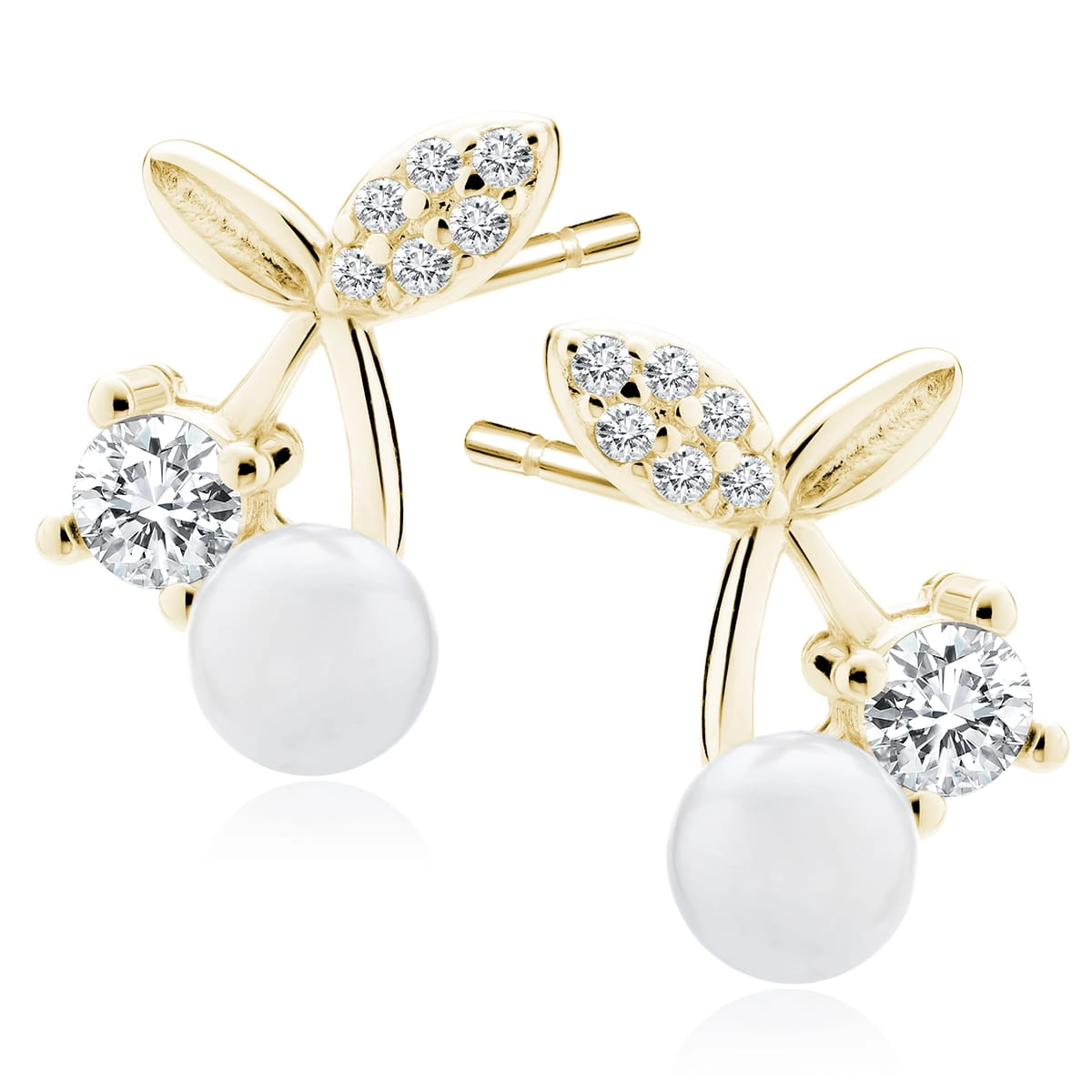 SREBRNE KOLCZYKI 925 złote Wisienka z cyrkoniami i perłą, Pozłacane damskie