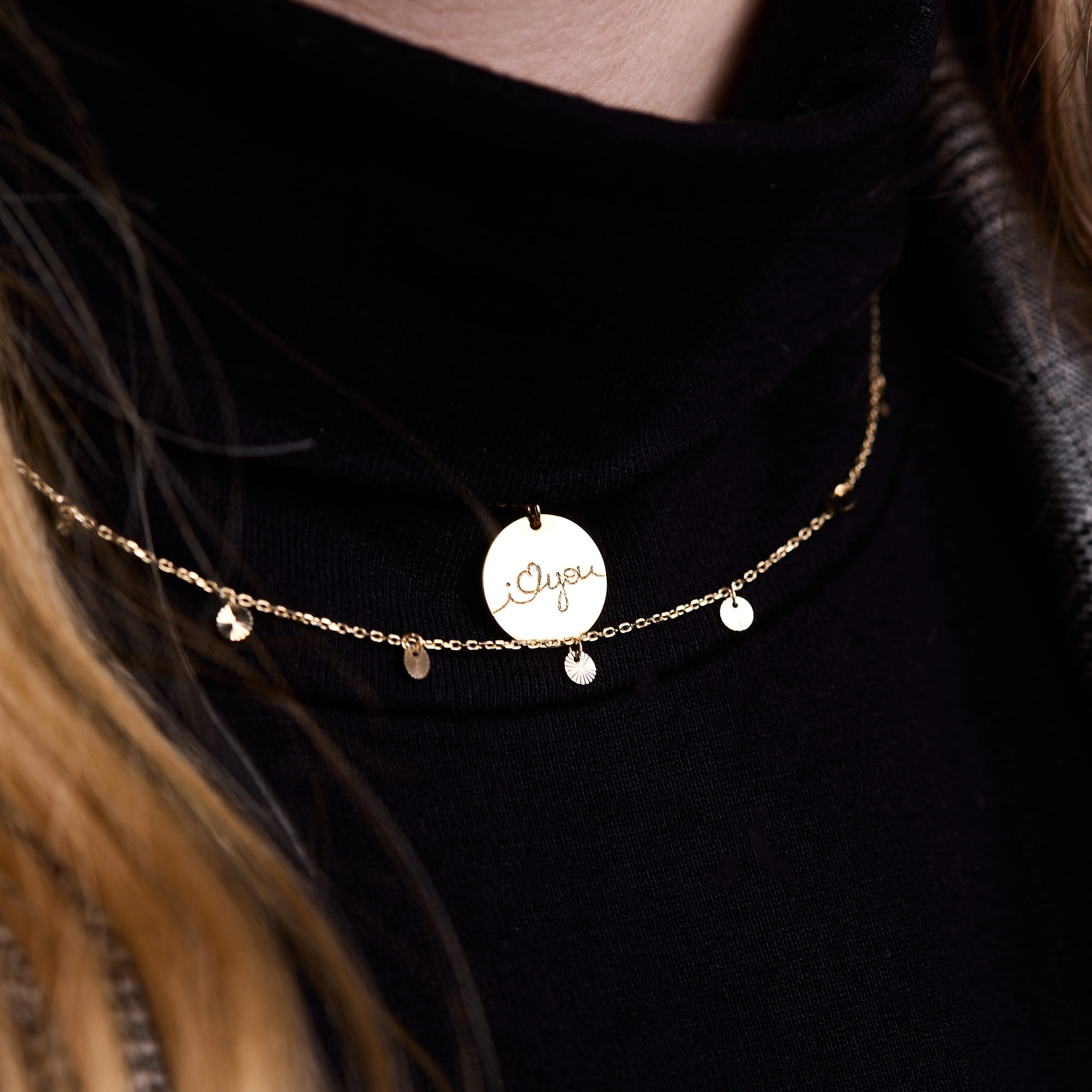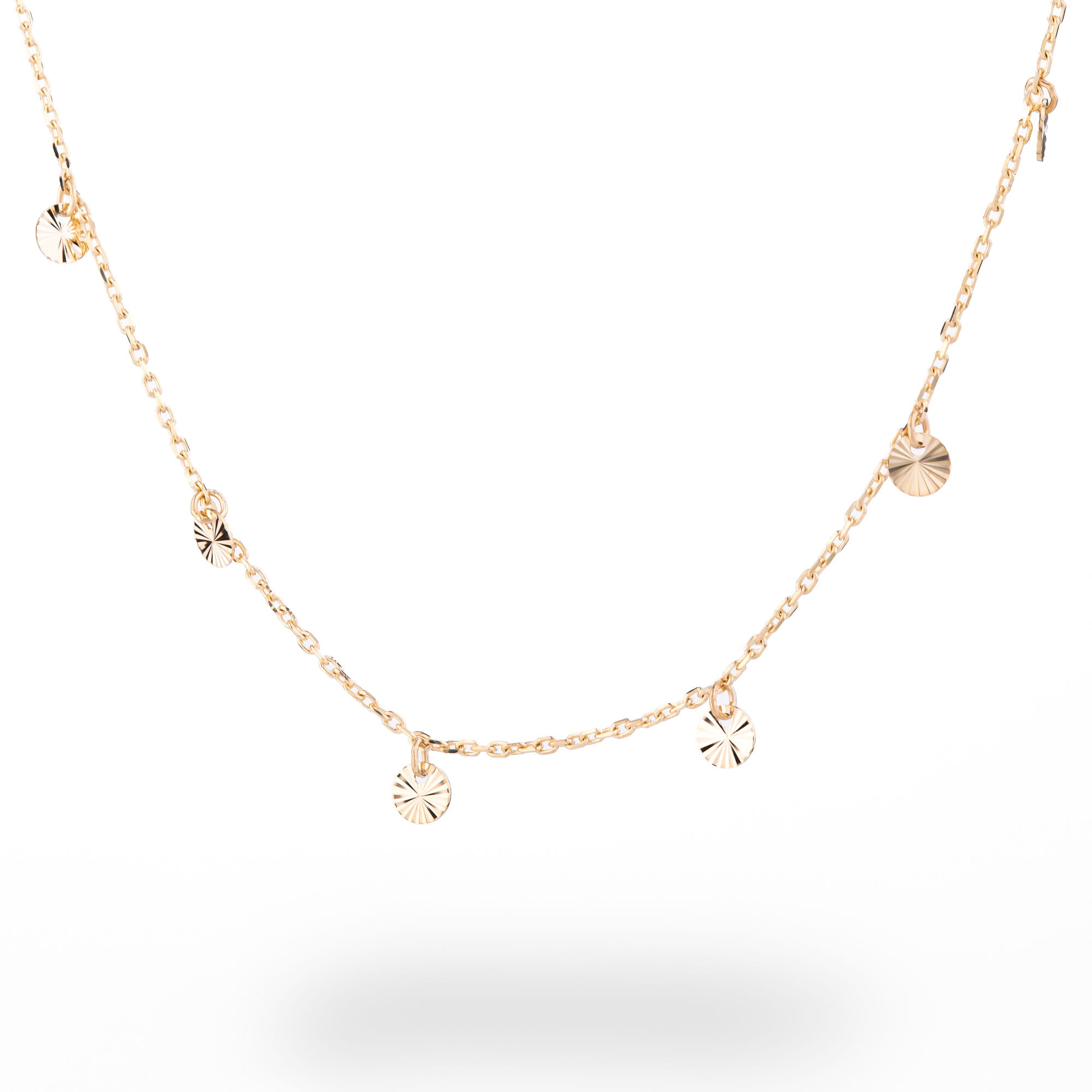 Złoty naszyjnik celebrytka z błyszczącymi przywieszkami, regulowana długość.