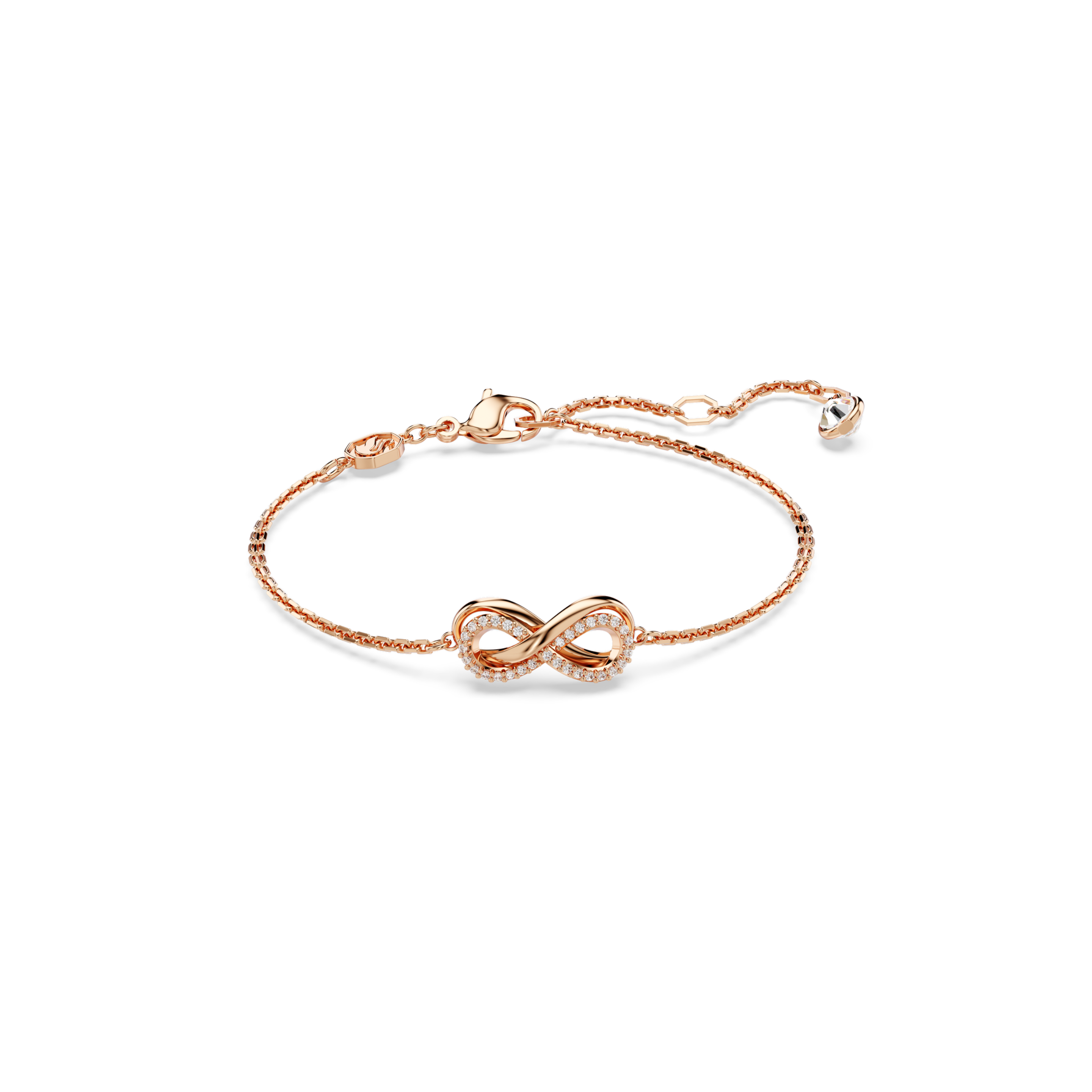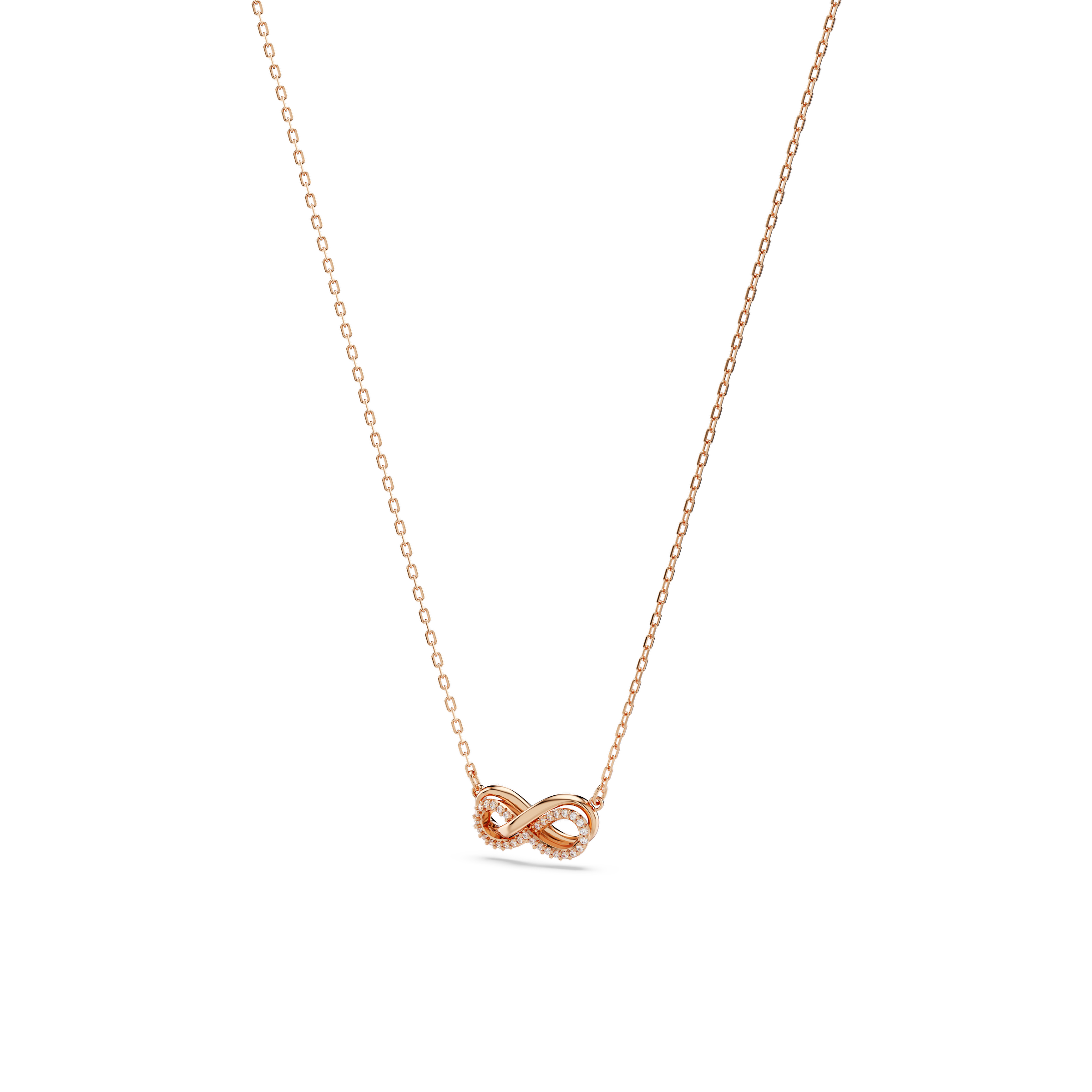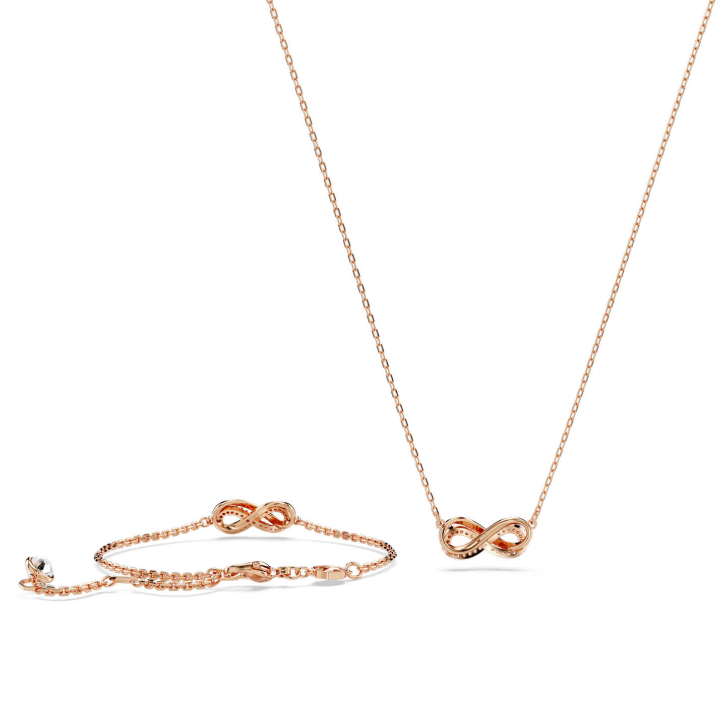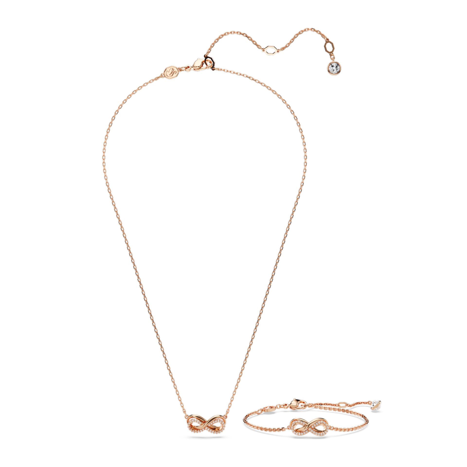 Urzekająca nieprzemijającym pięknem biżuteria z rodziny Hyperbola jest wprost stworzona do warstwowych stylizacji. Ten komplet z powłoką w odcieniu różowego złota składa się z naszyjnika z wisiorkiem oraz bransoletki z ponadczasowym motywem przedstawiającym symbol nieskończoności. Motywy są upiększone bezbarwnymi kryształami w oprawie brukowej, a na przedłużce każdego łańcuszka znajduje się pojedyncza cyrkonia Swarovskiego. Ta dobrana para zapewnia przepiękny wygląd roztaczający aurę luksusu.