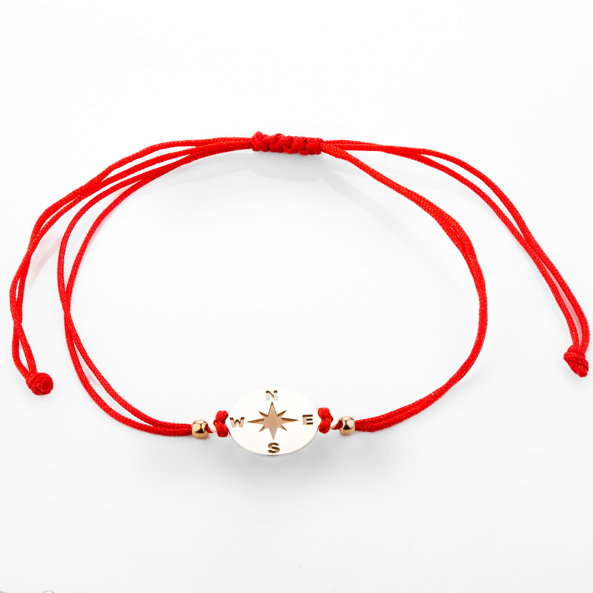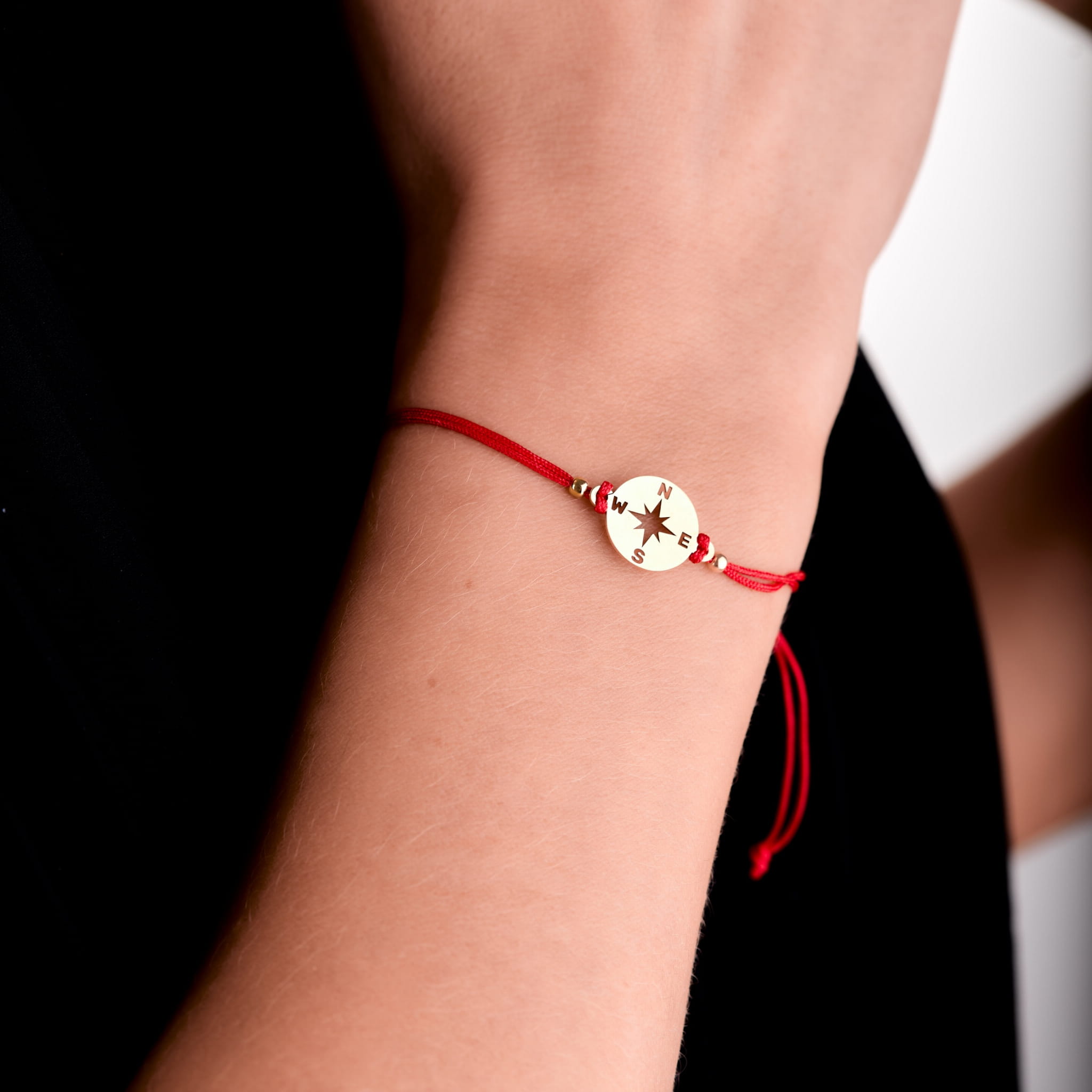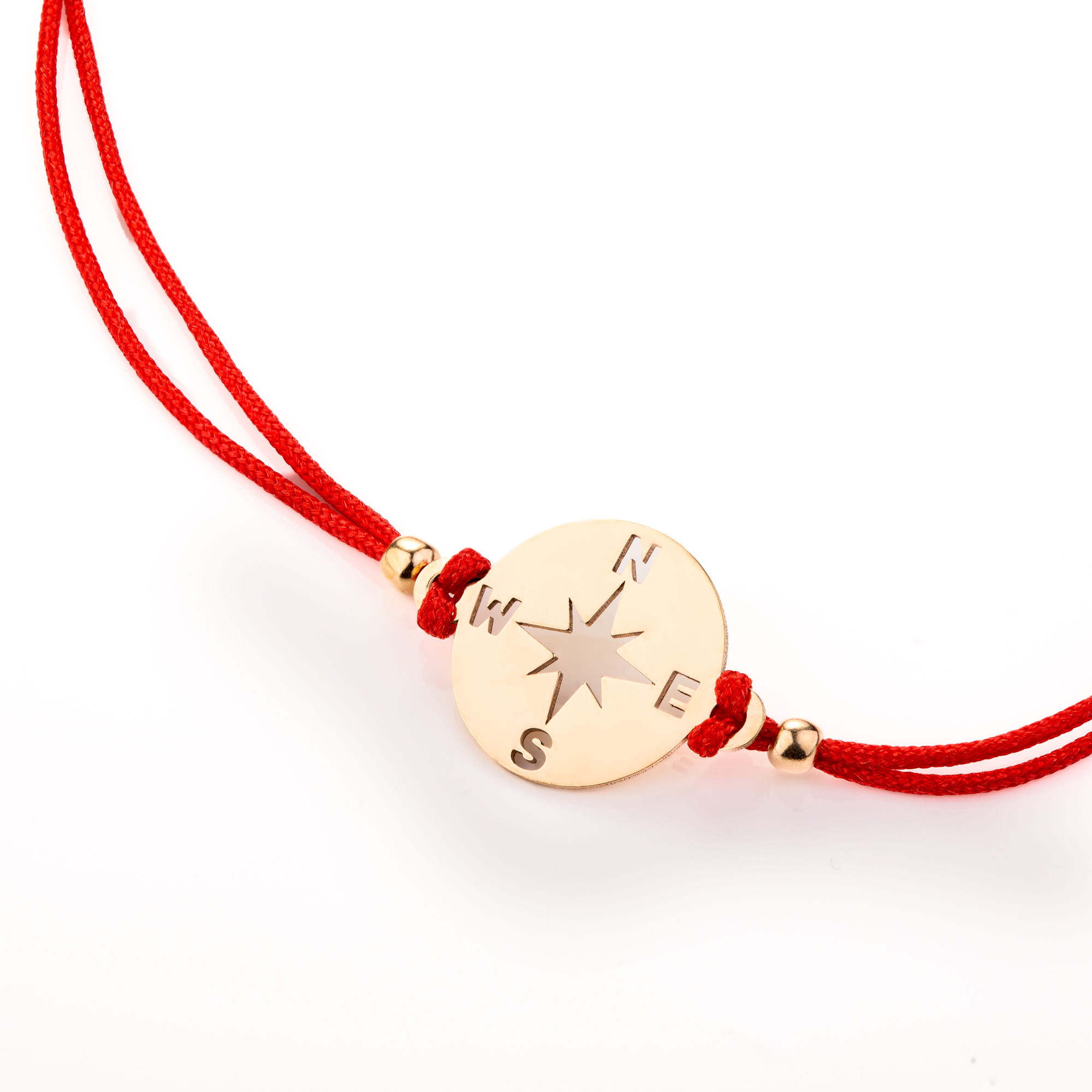 Złota bransoletka na czerwonym rzemyku kompas, podróże - złoto 585 (14K)