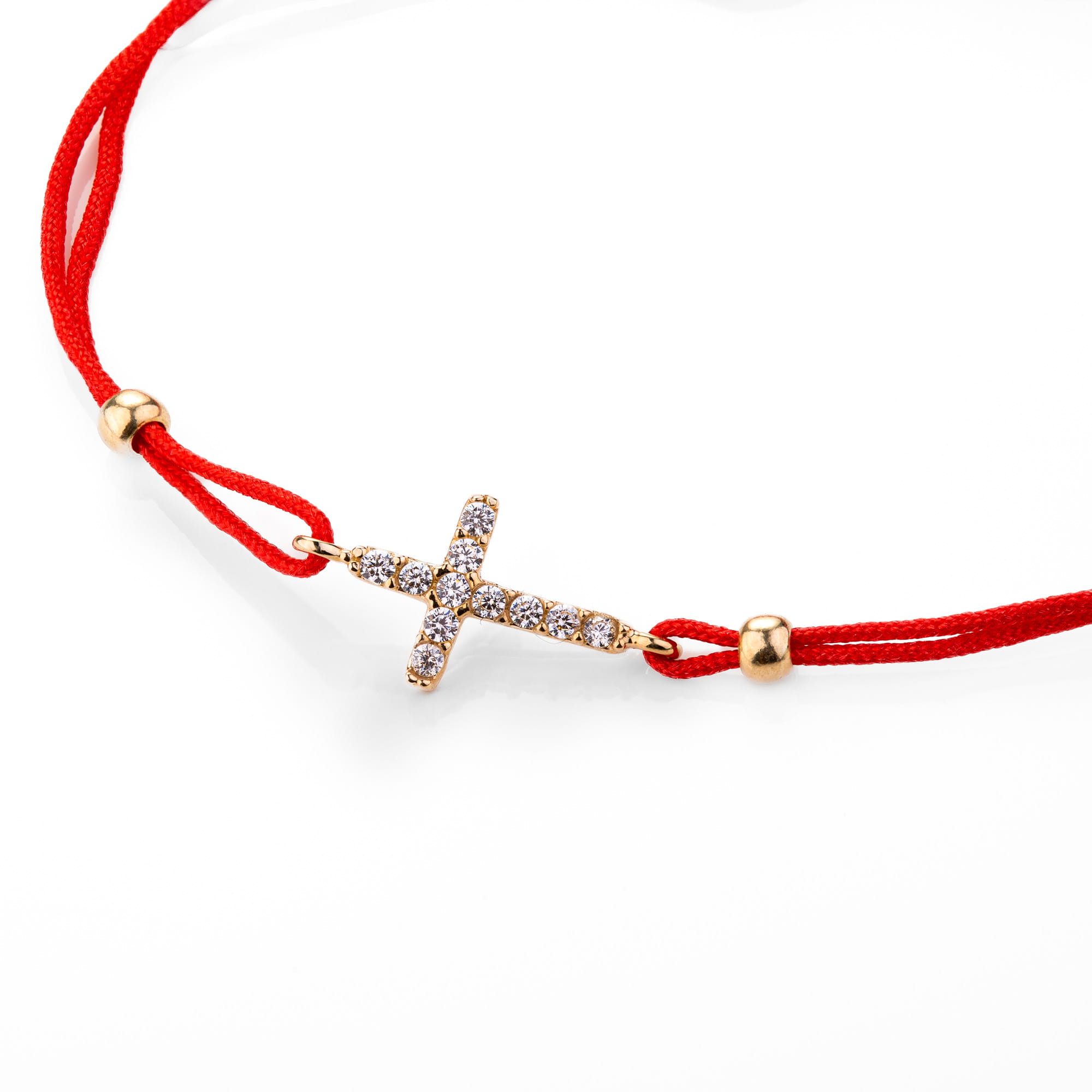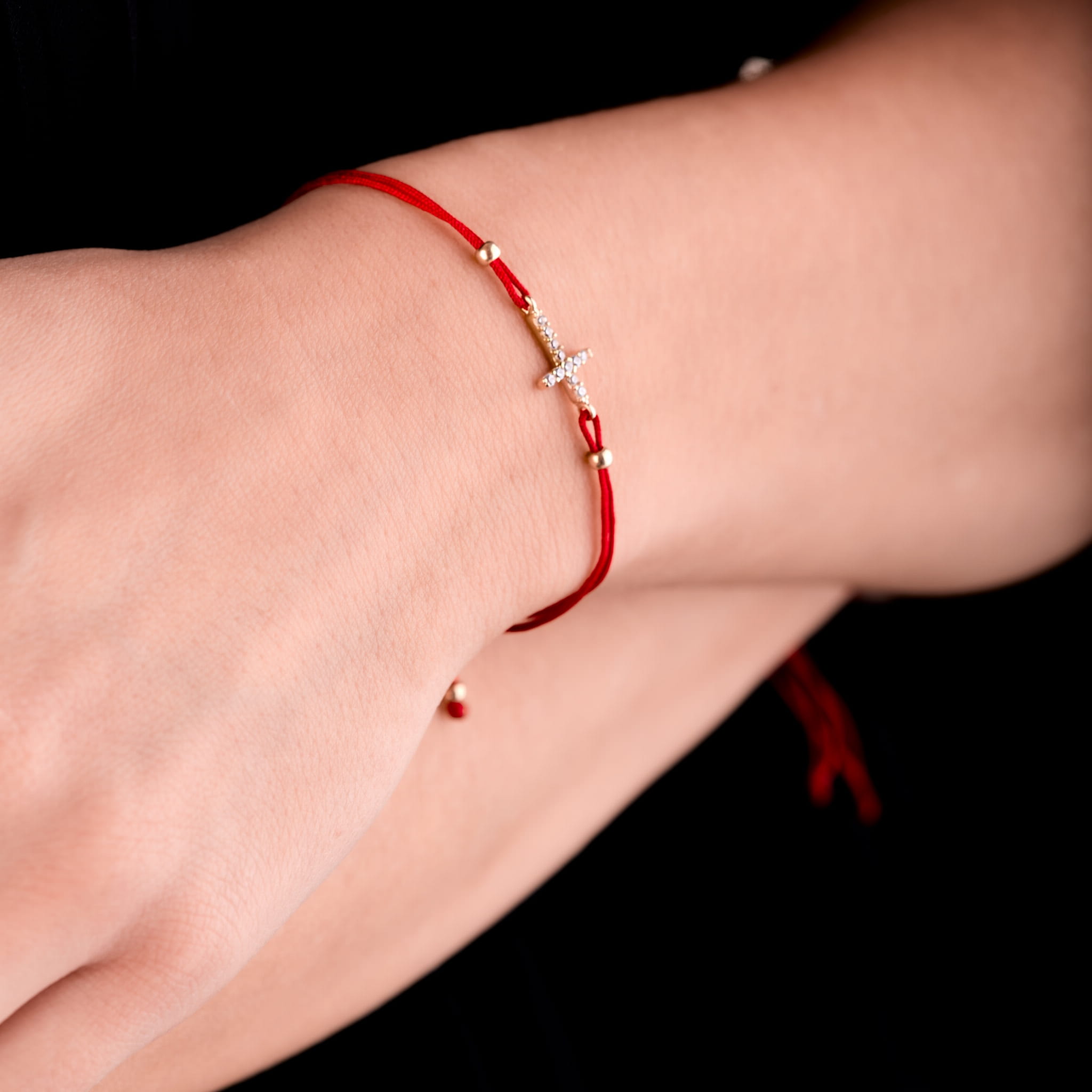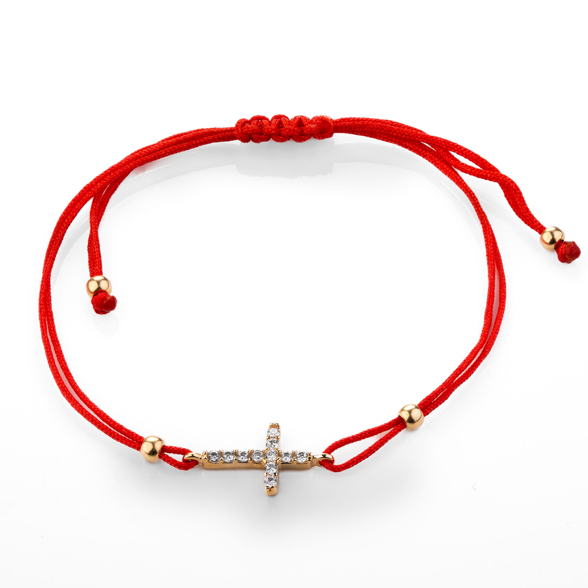 Złota bransoletka na czerwonym rzemyku z motywem krzyża z cyrkoniami - złoto 585 (14K)
